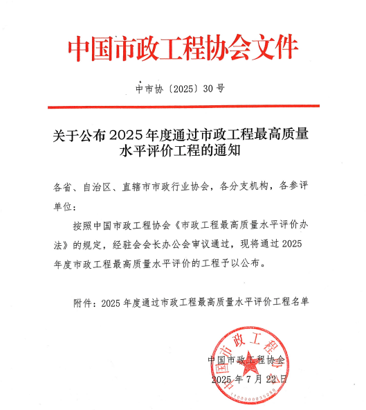 全国市政工程最高质量水平评价是对市政工程项目质量全面性和系统性管理的最高认可,代表国内同期工程领先水平。此次集团承建项目和养护项目同时获此殊荣,是集团整体技术实力、管理水平和品牌影响力的集中体现,更有力地印证了集团在设施养护与工程建设业务协同发展中的领先优势。