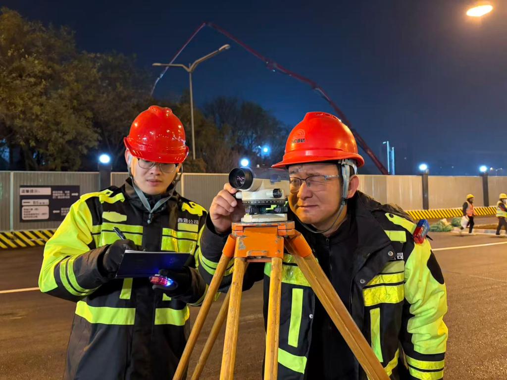 攻坚途中不乏暖心瞬间。四公司“00后”施工员小张因首次参与重大工程,面对测量表迟迟不敢落笔。技术负责人立刻上前示范,细致讲解夜间测量要点,复核后笑着肯定他:“你测的数据一个都没错”,用信任与指导为年轻人注入信心。