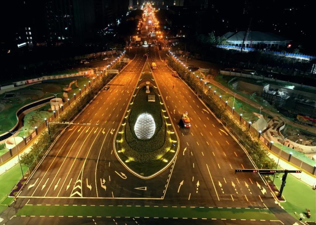 施工内容包括组织开展东西南北四个方向连通段道路抢通工作、路面沥青铺设等关键工序,共完成沥青上、中、下面层摊铺约20000平方米、约3000吨,基层及底基层二灰石摊铺约3000平方米、约1500吨,路缘石安装550余米、雨水口13座、路灯11套等,实现了环岛交通模式向十字路口模式的平稳、准时切换。