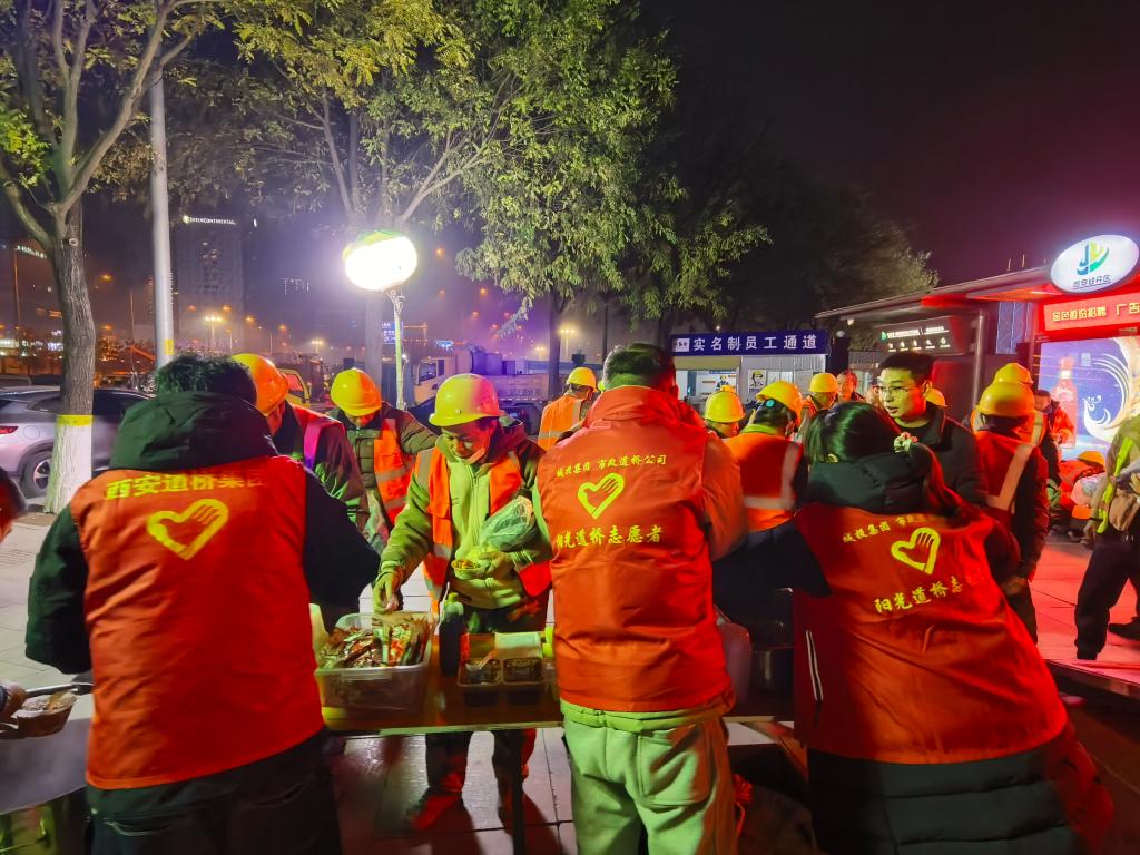 12月6日晚,是交通切换工程“三夜两天”施工任务倒数第2天。西安道桥集团“暖冬送关怀”慰问活动走进施工现场,为集团一线建设者送去热腾腾的餐食和厚实的防寒物资。集团领导班子成员,总部相关部门负责人,30余名阳光道桥志愿者参加慰问。