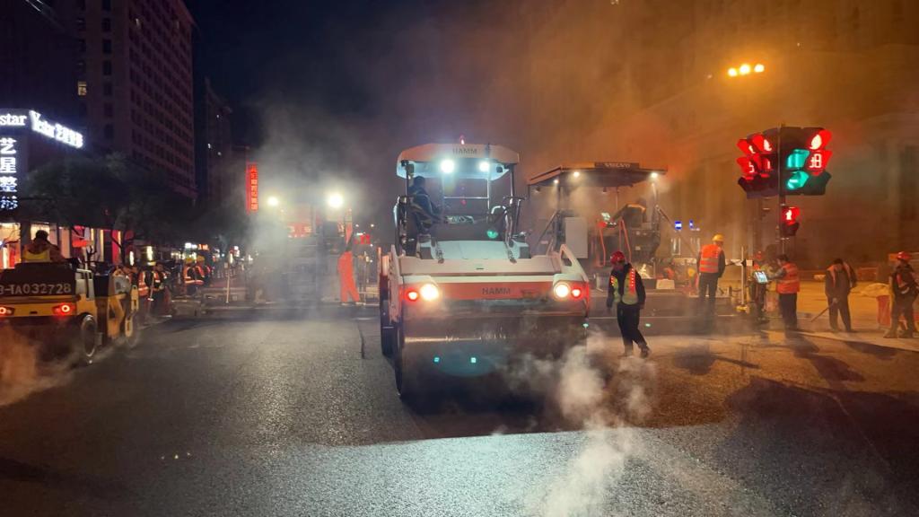 12月13日1时许,西安市南北中轴线微改造钟楼北至二府街段灯火通明。施工员身着反光防寒服、反光背心,布置好安全作业区后开始沥青上面层摊铺施工。大型摊铺机缓缓驶入既定位置,施工人员严格按照标准化作业,从摊铺厚度、沥青混合料温度以及摊铺层的表面质量等方面,对施工各环节进行全程监控,经过4小时的奋战,高标准完成了沥青面层摊铺施工。