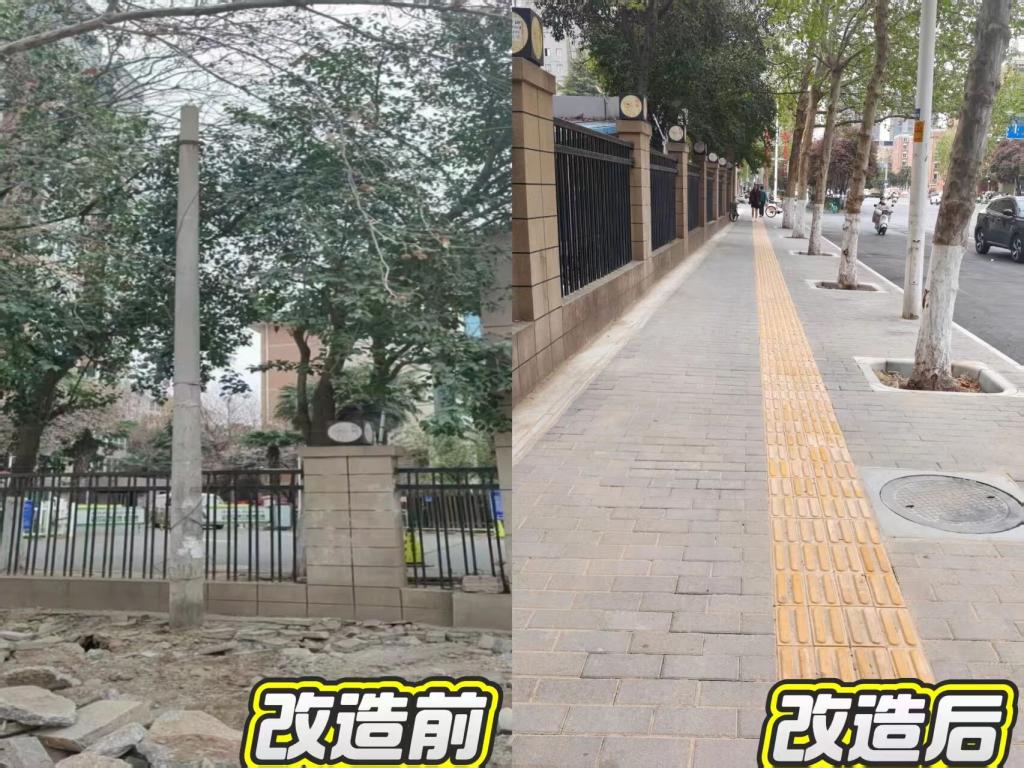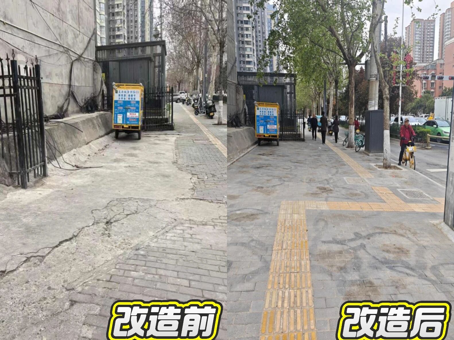 凤城一路十字东南角红线外区域,原路面坑洼不平、扬尘积水、环境脏乱。项目部主动担当、靠前服务,全面破除旧路面、新铺人行道、增设盲道设施,让脏乱区域变身平整美观、功能齐全的便民步道,既守牢脚下安全,又提升城市风貌。