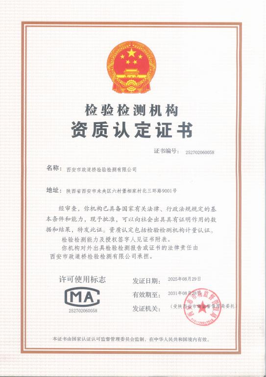 近日,西安道桥集团下属子公司检验检测公司完成CMA资质复审、参数扩项、场所变更等评审工作,取得新版CMA资质认定证书,建材检测能力进一步提升。