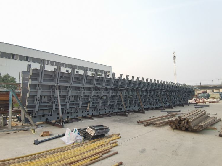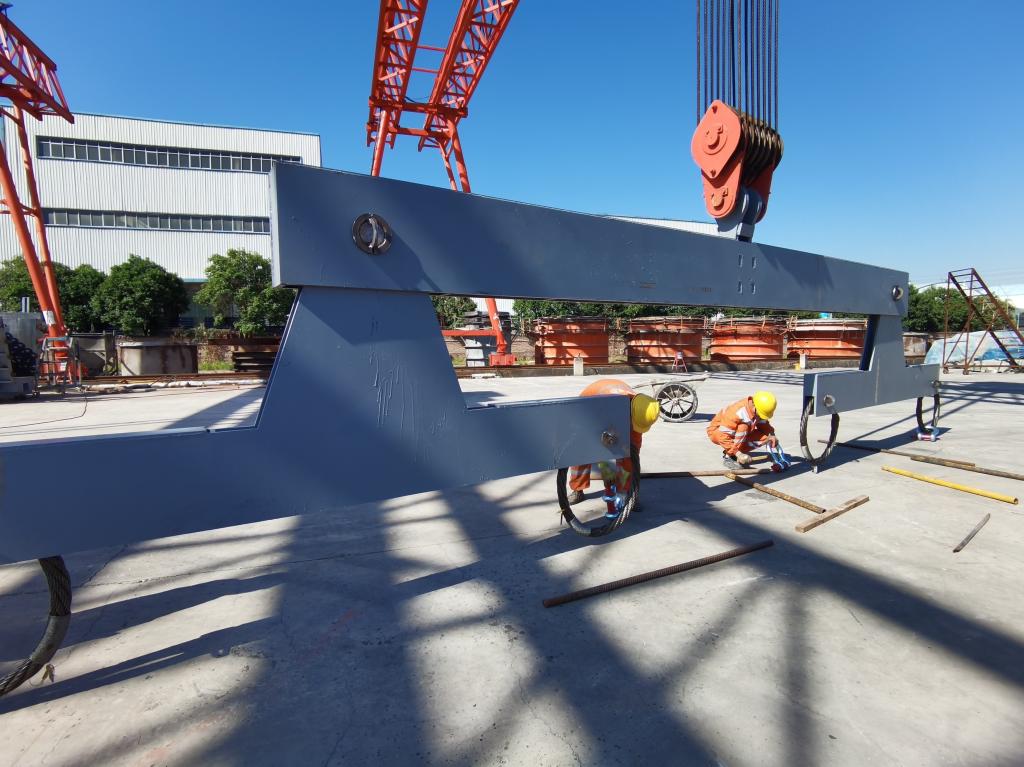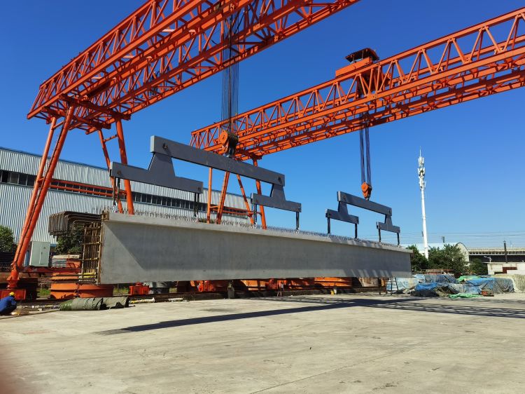 该项目难点是吊装难度大、组模效率差,加上现场环境复杂,工期紧、任务重。针对预制梁生产安装专用160吨提梁机,自主设计专用多吊点自平衡吊具,能够同时满足梁长19-26m的吊装,既保证了构件整体安全起吊,又解决了各吊点之间起吊应力不均衡的技术难题。 针对大型预制构件组模效率差的技术难关,在预制梁、板生产前,对模具方案经过多次讨论和修改,采用铰接式侧开模+组合工装变换截面样式的拆组模方式,不但大大提升组模效率,也提高了模具利用率。 同时,制定详细的生产技术方案,为预制梁、板的顺利生产提供可靠技术保障。