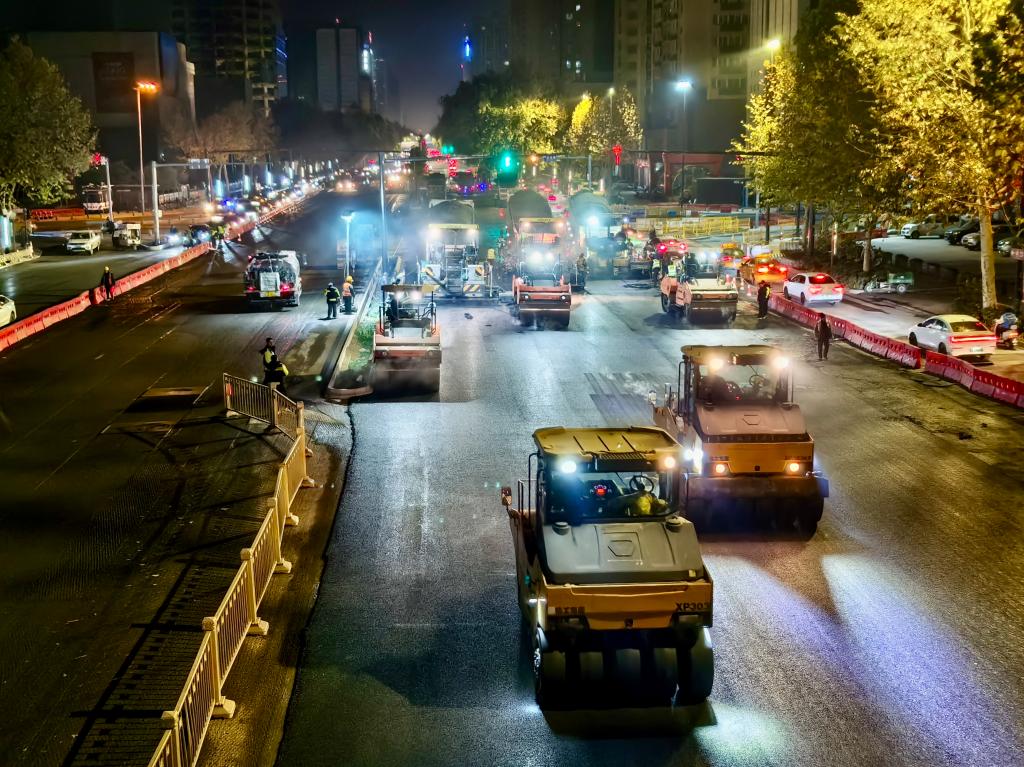 12月13日1时许,西安市南北中轴线微改造钟楼北至二府街段灯火通明。施工员身着反光防寒服、反光背心,布置好安全作业区后开始沥青上面层摊铺施工。大型摊铺机缓缓驶入既定位置,施工人员严格按照标准化作业,从摊铺厚度、沥青混合料温度以及摊铺层的表面质量等方面,对施工各环节进行全程监控,经过4小时的奋战,高标准完成了沥青面层摊铺施工。