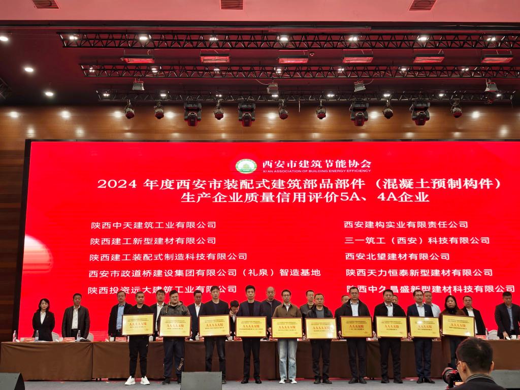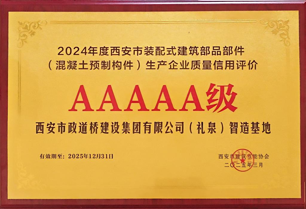 近日,西安市建筑节能协会公布了2024年度装配式建筑部品部件(混凝土预制构件)生产企业质量信用评价结果,西安市政道桥建设集团有限公司(礼泉)智造基地荣获AAAAA级生产企业质量信用评价。