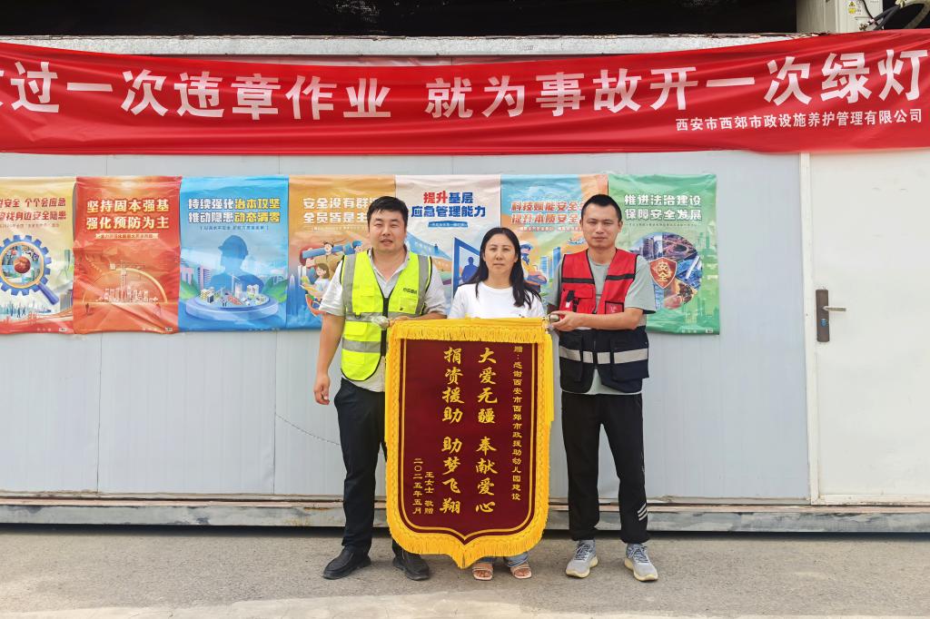 6月10日,西安市高陵区一幼儿园老师专程来到道桥集团西郊公司高陵维护项目部,送上了一面印有“大爱无疆、奉献爱心、捐资援助、筑梦飞翔”内容的锦旗和幼儿园的孩子们最纯真的谢意。
