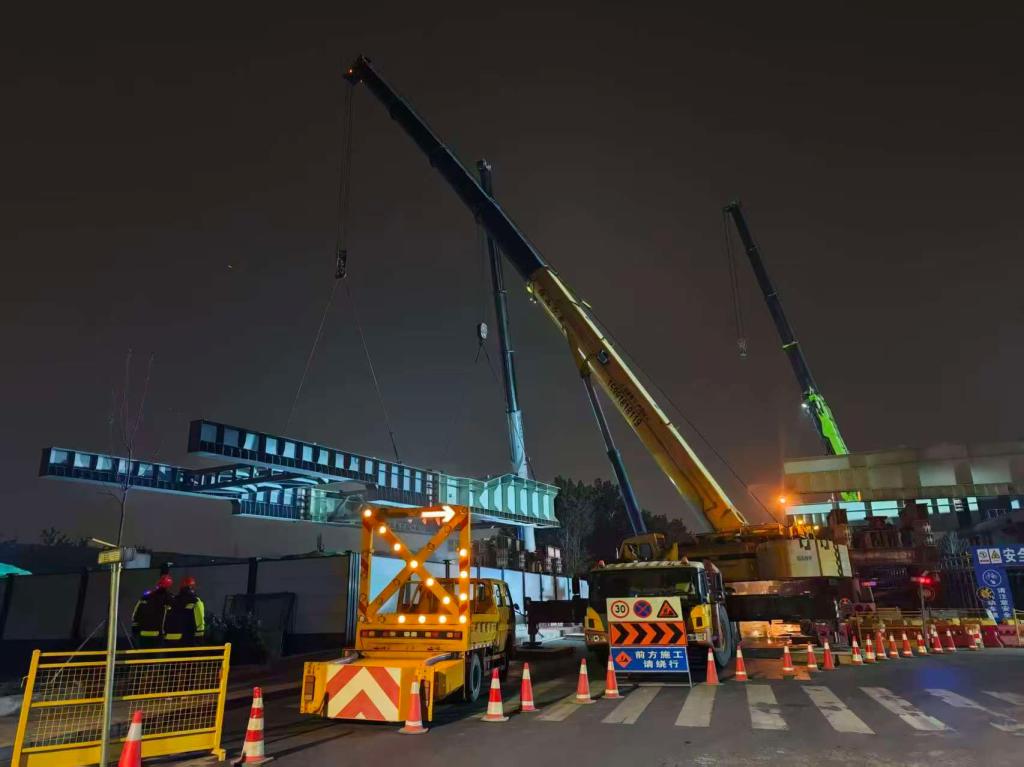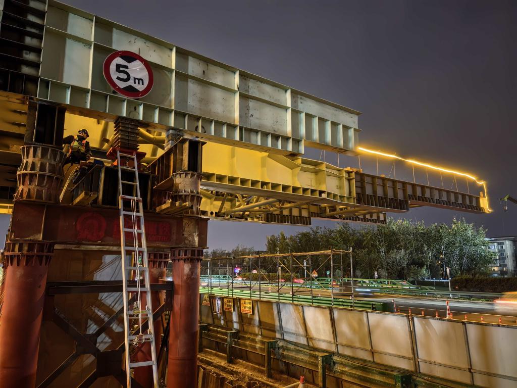 广运潭大道跨绕城高速项目南起袁雒路,北至灞浦一路,道路全长约1.1公里,主线桥梁全长约425.4米。本次顶推施工段为107.43米钢箱梁,采用分阶段顶推工艺,从11月12日至11月21日,安全顺利完成跨绕城高速施工。