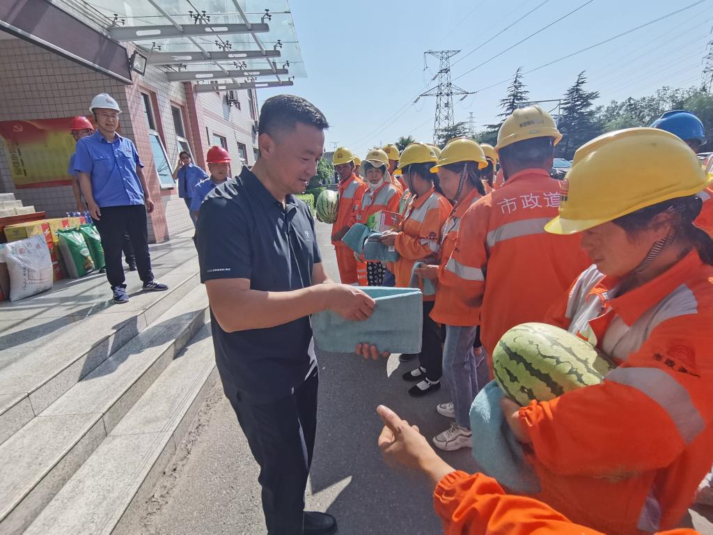 炎炎夏日送清凉,滴滴关怀沁人心。连日来,城投集团建设公司领导以及道桥集团领导班子成员分别来到各施工现场,看望高温时节坚守岗位的一线员工,并送上清凉饮料、绿豆、西瓜、藿香正气水、金银花茶等防暑降温慰问品,表达深切的问候,让每一位员工感受到了公司党委和工会的关怀,切身体会到了公司在高温下给大家带来的丝丝“凉意”。