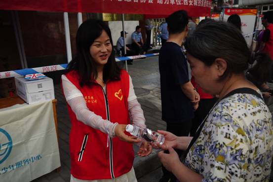 清晨六点多,志愿者们就来到考点外,搭建起服务站点,搬运物资、布置服务点,静待考生和家长的到来。随着考试的临近,越来越多的考生和家长聚集在考点周围。志愿者们迅速行动起来,为考生和家长提供免费的矿泉水,贴心地撕掉矿泉水的包装方便考生携带。同时,考虑到可能会有考生因紧张而遗漏文具,服务站点还准备了充足的文具用品,供考生们免费取用。志愿者们带着满满的关心和爱心,与考生们愉快地交流,并嘱咐考生:“不要紧张,平常心应对”“好好休息、认真作答”“考试时,要把握好考试时间节奏,细心对待每一道题。”一句句关心和问候,化作源源不断的动力,为考生加油打气。