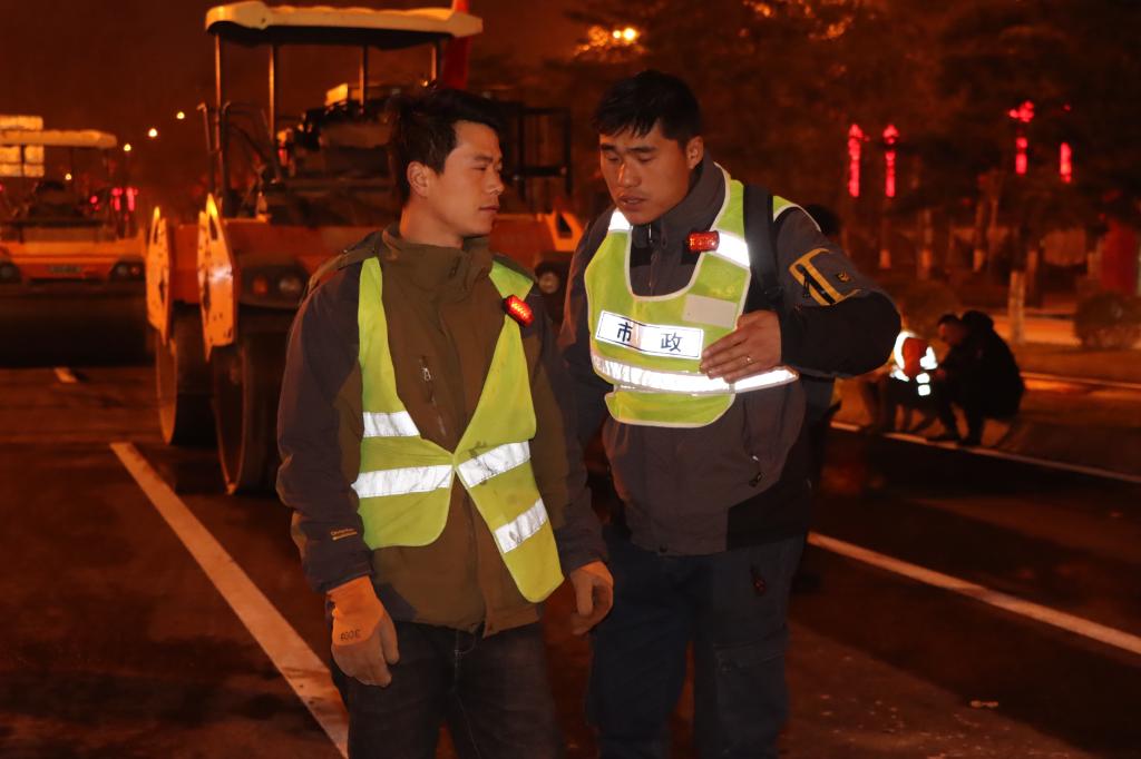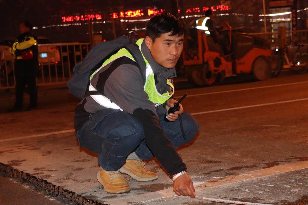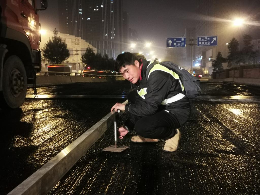 徐超所在的项目二部承接南门外盘道至小寨十字夜间摊铺任务,这段项目处于西安市的中轴线,车流量大,交通情况复杂。为保障夜间施工安全和质量标准,每一个夜班来临前,他都会先去凌晨刚完工的施工路段逐一排查问题点,对于处理不到位的地方做出重点标注。搜集完现场资料后,他会第一个来到项目部,结合查找的问题点,认真分析前一天施工过程中存在的不足,根据技术方案再次制定提升平整度、检查井的合格率的方案,并将所有任务分解,具体措施落实到人。