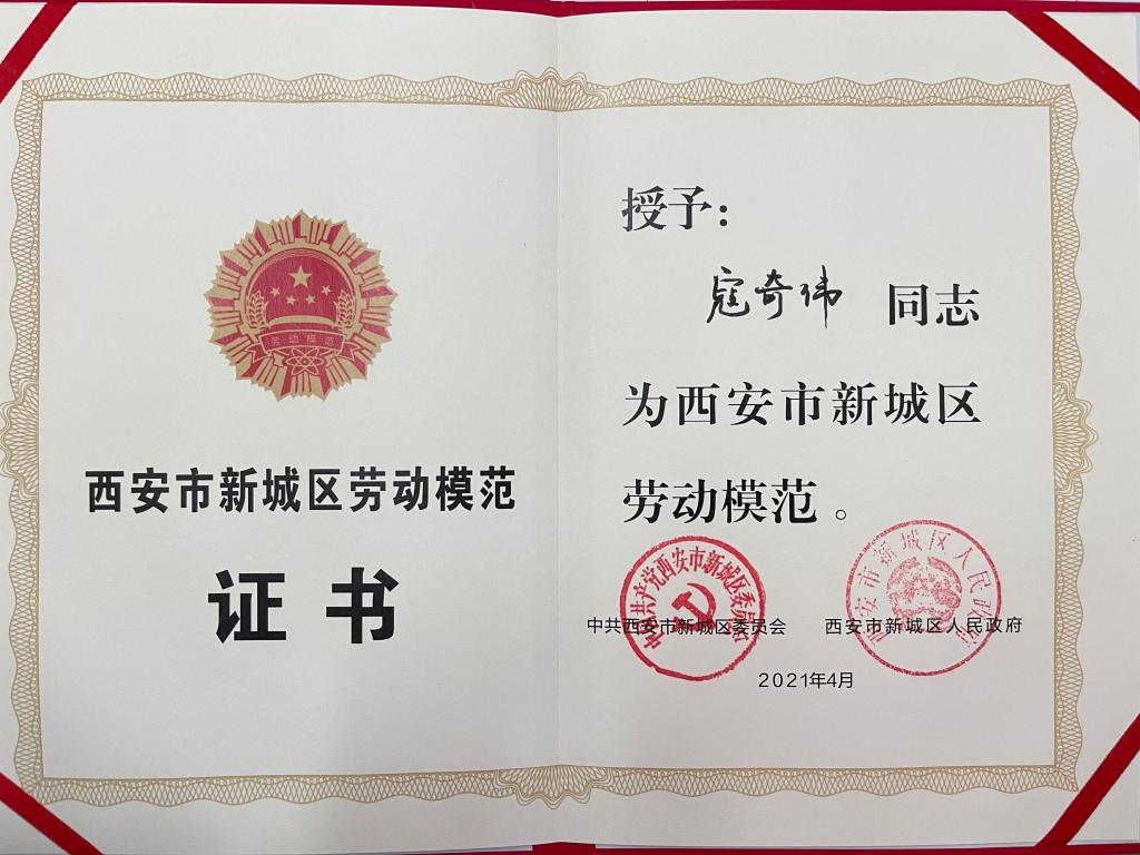 4月29日上午,西安市新城区劳动模范和先进集体表彰大会在新城区区委隆重召开,我公司寇奇伟同志荣获新城区“劳动模范”光荣称号。