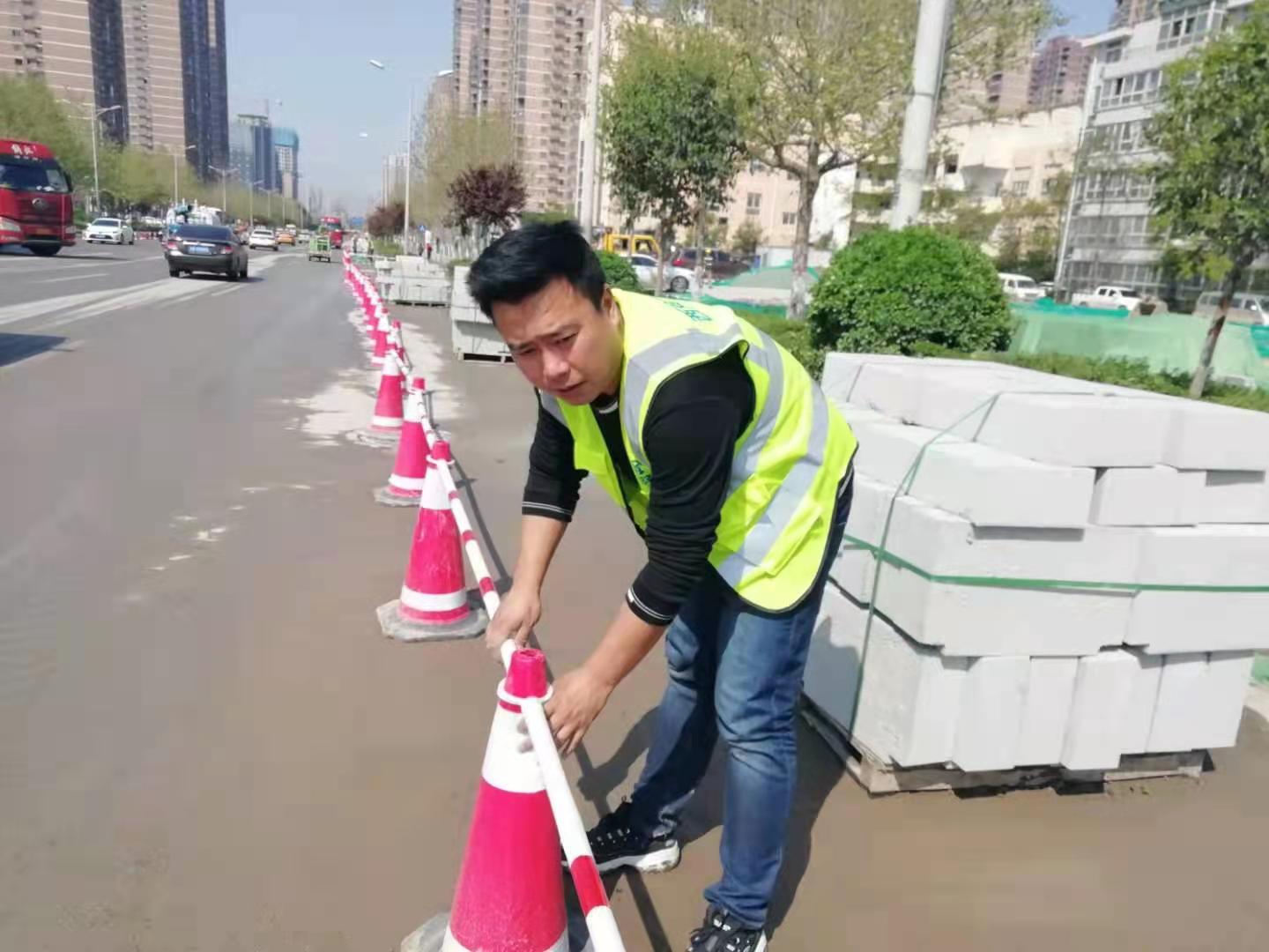 到了施工现场,他口袋里装满钢板尺、塞尺、钢卷尺,身上、手上拿着图纸及仪器,每天徒步10余公里,发现的问题及时纠偏,车后备箱装满了各类安全设施,快速路、桥面上随时进行巡查补充及更换。以质量优先的原则控制施工进度,增加各专业班组的数量,在不妨碍城市道路正常运行的情况下,抢工期,抓节点,按时保量的完成了一个又一个工程任务。