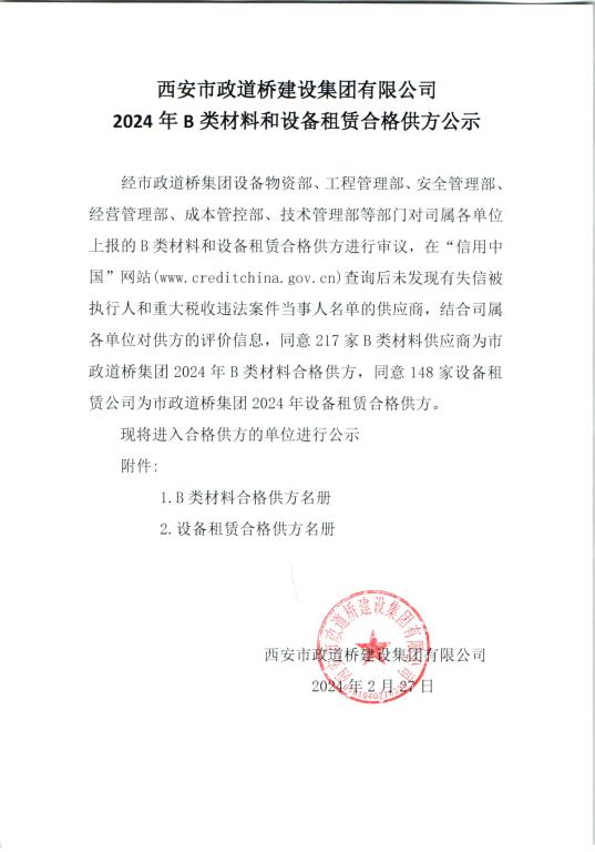 西安市政道桥建设集团有限公司2024年B类材料和设备租赁合格供方公示