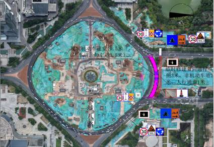区域一:张家堡环岛(北侧)道路改造,由东向西绿化带、非机动车道、人行道,将全封闭施工,占用绿化带、非机动车道和人行道,围挡长度125米,由东向西方向紧邻围挡北侧新建1条临时便道供非机动车、行人通行。机动车道及两侧辅路通行不受影响。(附图:交通疏导示意图1)